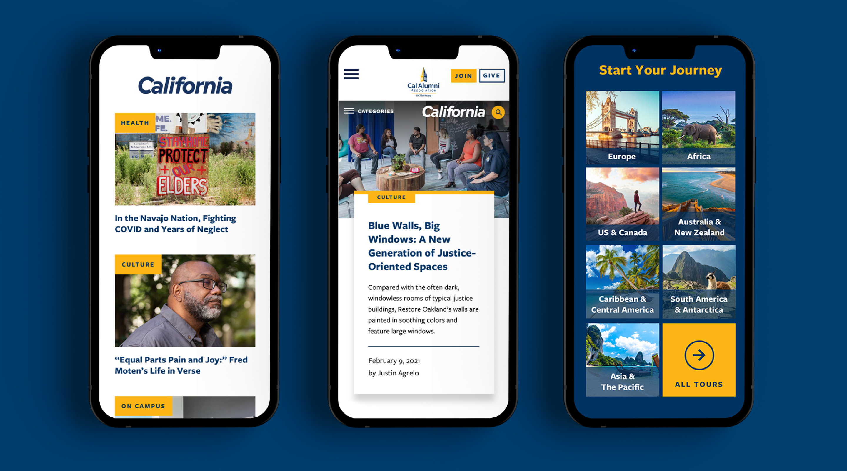 For Cal, this meant incorporating three key conversion points into the homepage so that, as soon as users arrive, they are driven to either Join CAA, Give Back or Get Involved. To add a little heft to these calls to action, we tapped into the university’s reputation as one of the greatest schools in the world, reminding alumni that they are part of a truly special community. Messaging such as “Alumni are the Cal legacy. A gift in support of CAA keeps us all connected — to UC Berkeley and to each other” showcases the magnitude of alumni giving while also fostering a sense of community among former students.