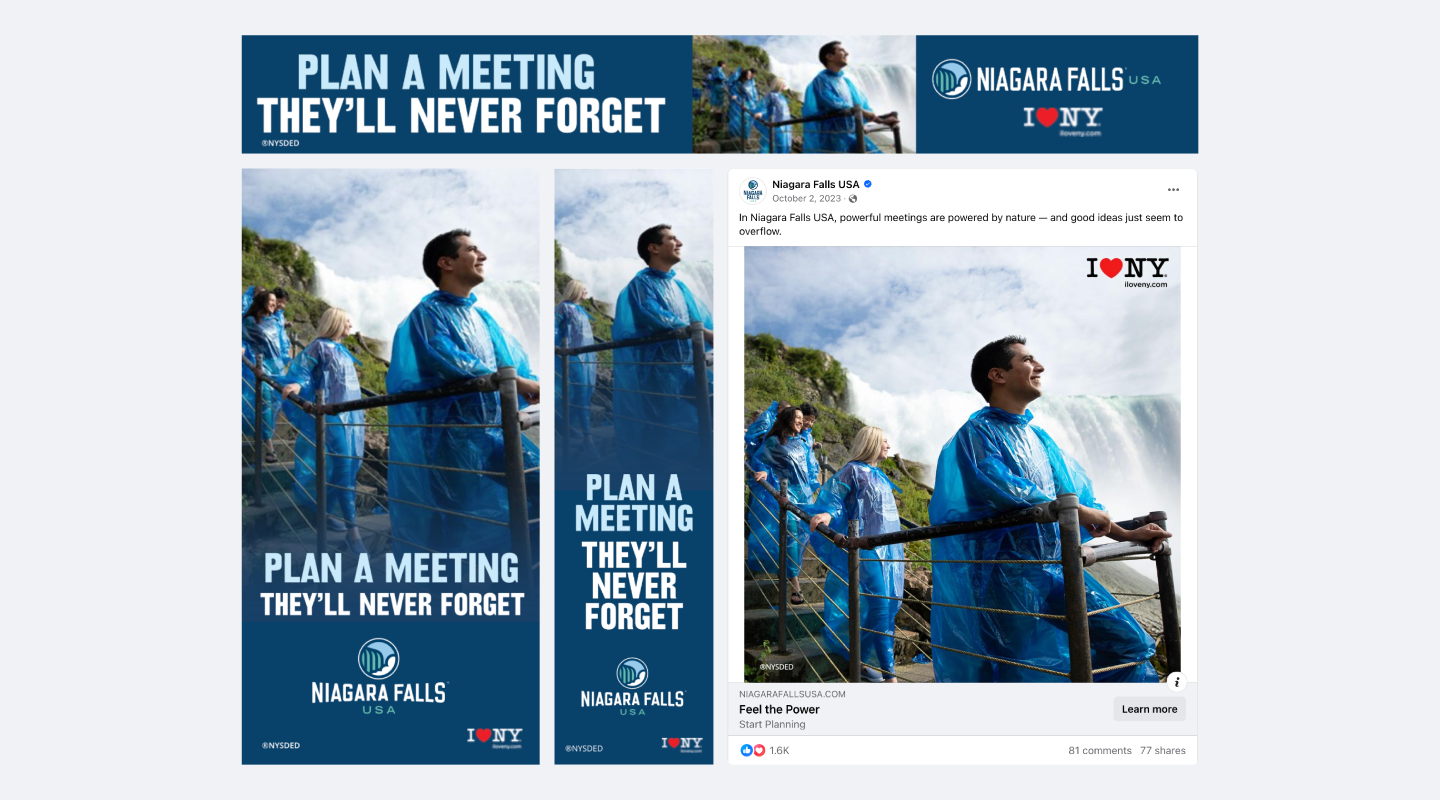 Digital ads and sponsored social posts are no doubt already a mainstay in your marketing mix. Carry these strategies into your meeting outreach, too, speaking directly to meeting planners. Striking imagery coupled with the right messaging is a tried-and-true strategy for capturing this niche audience, as evidenced by the display and social ads we produced for Niagara Falls USA.